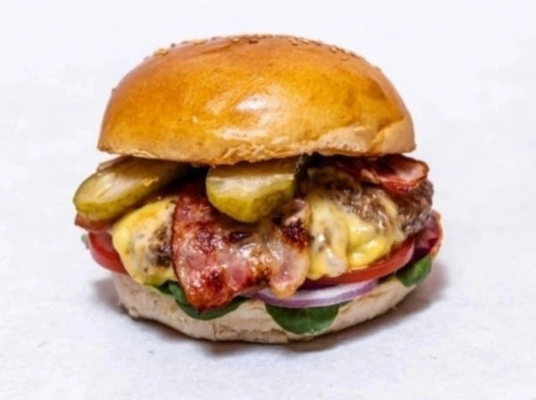 Domáca žemľa, 150g 100% hovädzie mäso, americký domáci dresing, polníček, rajčina, grilovaná slaninka, cheddar syr, červená cibuľka, pickles uhorky