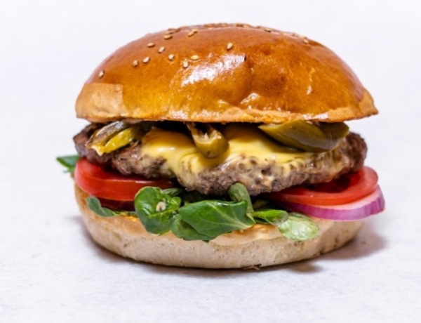 Domáca žemľa, 150g 100% hovädzie mäso, pikantný dresing, rajčina, polníček, červená cibuľka, jalapeňo papričky, cheddar syr